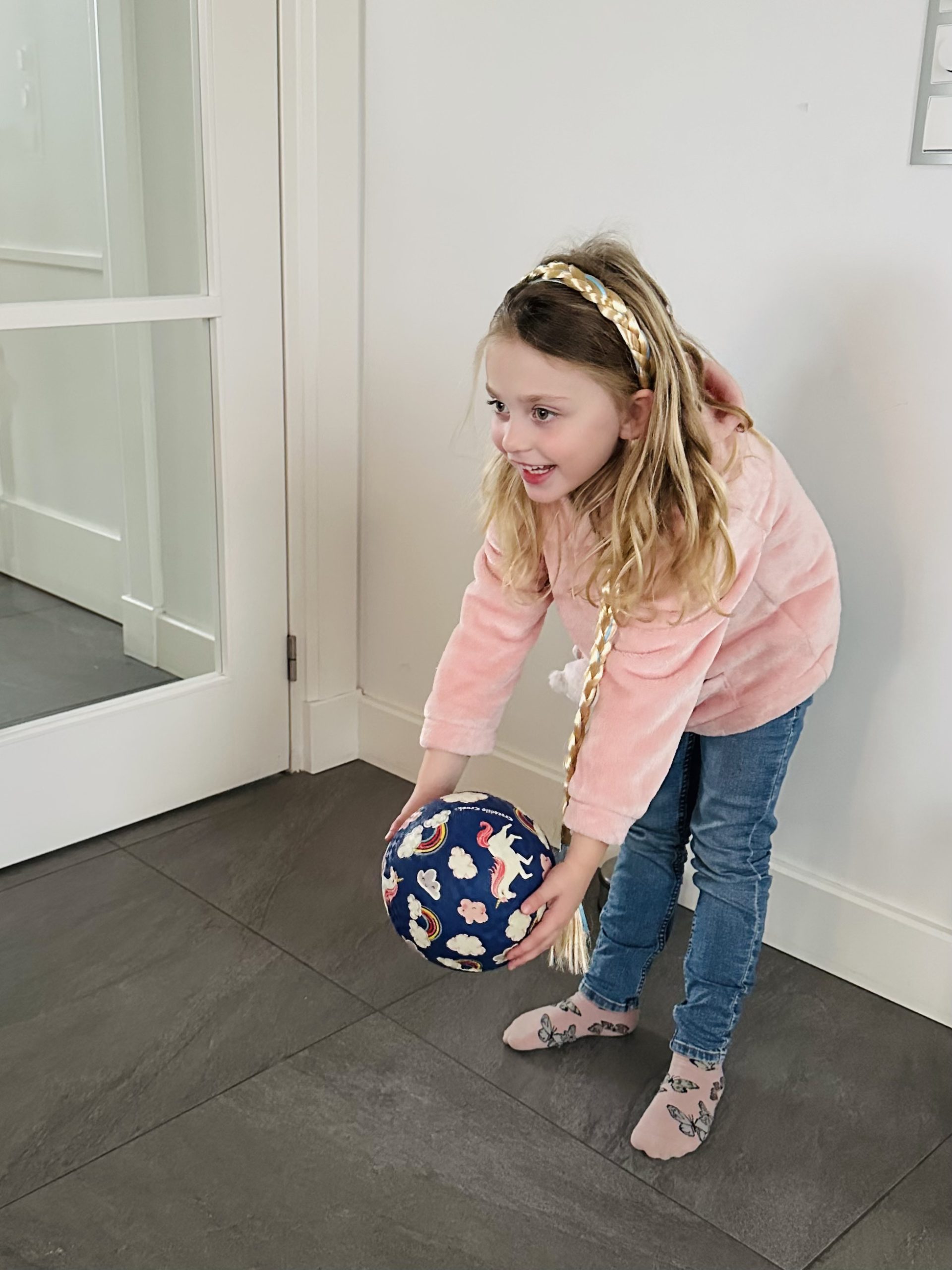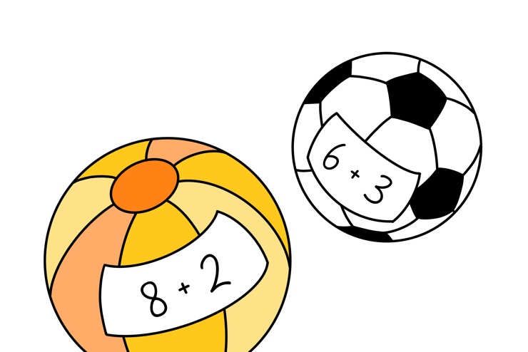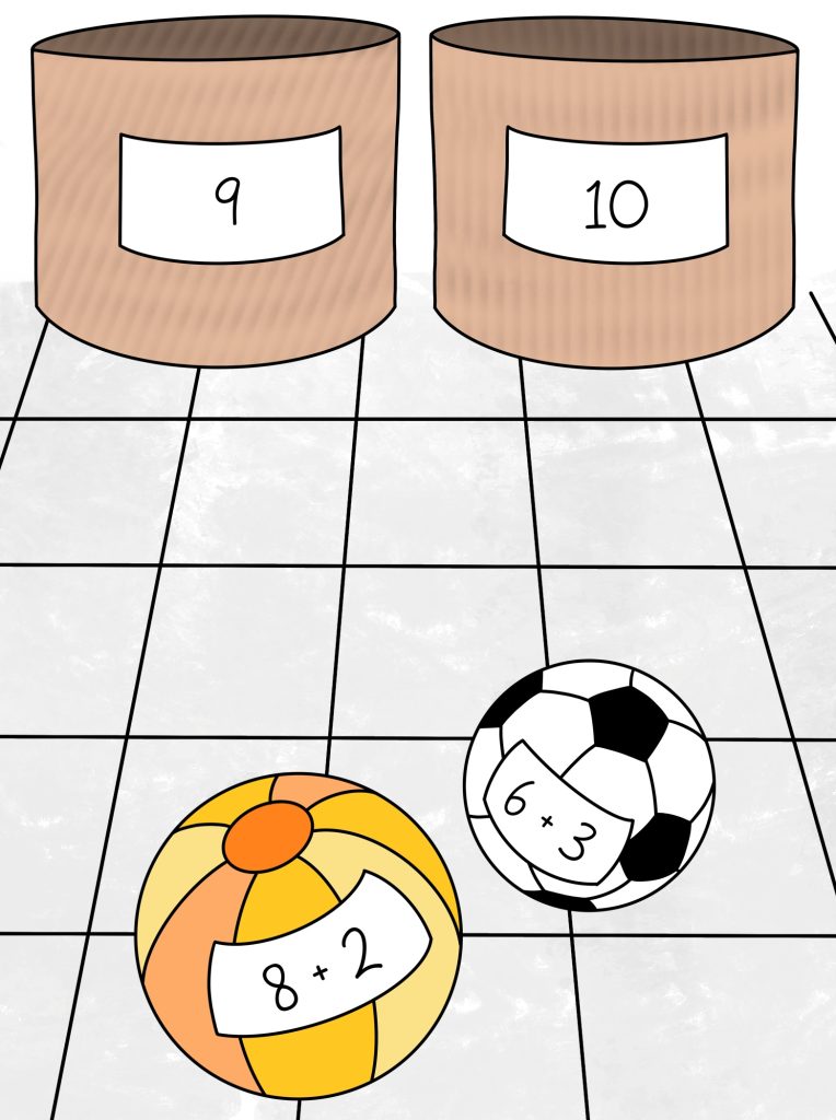 Gooi over met een bal. Tijdens het gooien, oefen je met sommen (bijvoorbeeld de sommen t/m 10).