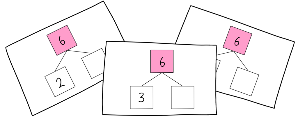 Maak kaartjes met de splitsingen die bijvoorbeeld bij de 5 en 6 horen. 6 kun je verdelen in 2 en..?