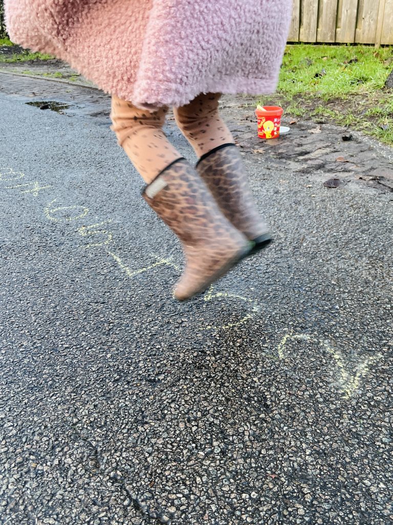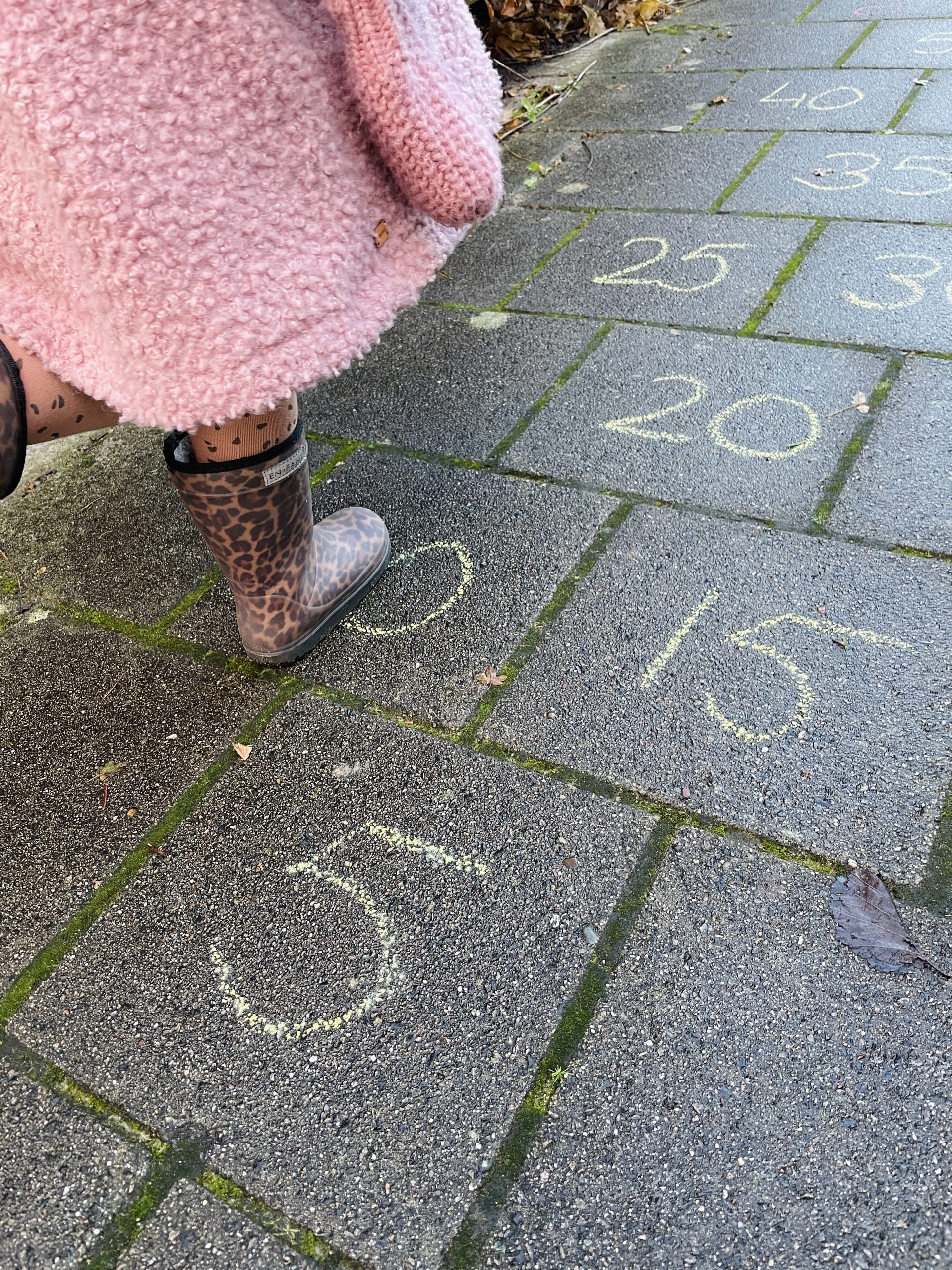 Teken een hinkelbaan met stoepkrijt. Schrijf de sommen van een tafel in de vakken.