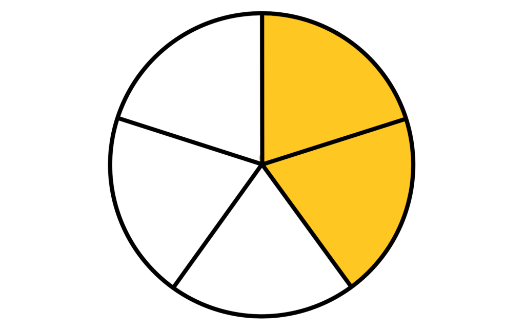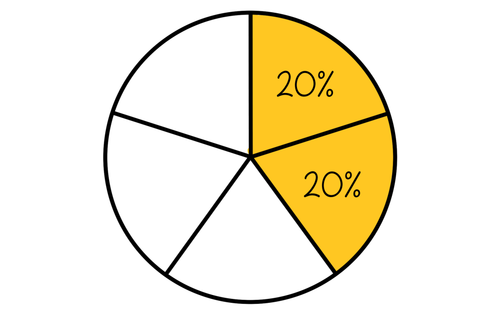 De hele cirkel is 100%. De cirkel is in 5 gelijke stukken verdeeld.