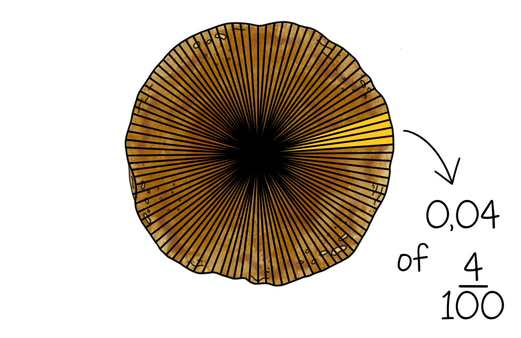 Misschien lukt het je nu al om hier een betere voorstellen van te maken. Denk maar aan een pannenkoek, die in 100 stukken is verdeeld en waar je stukken van mag opeten.