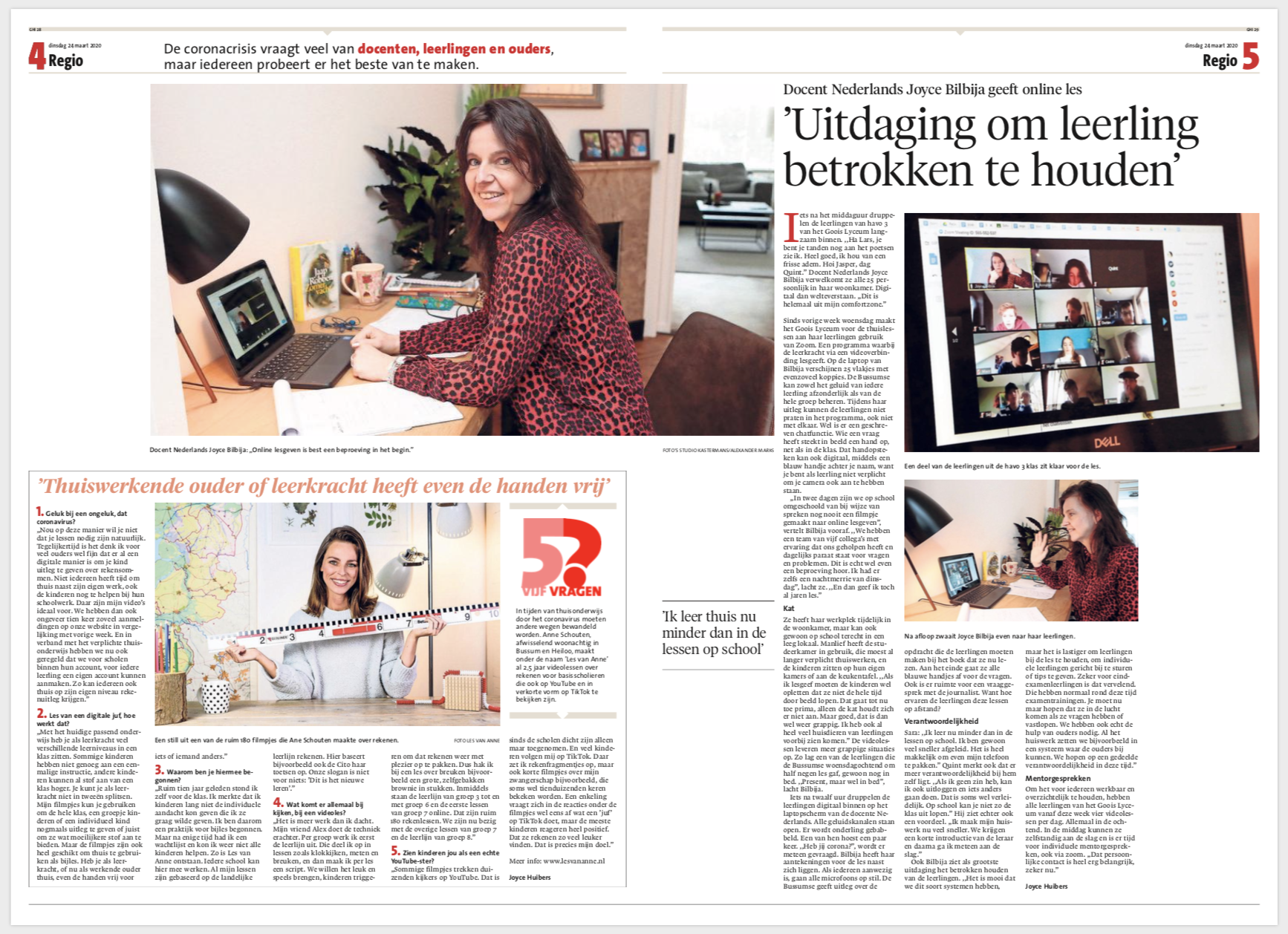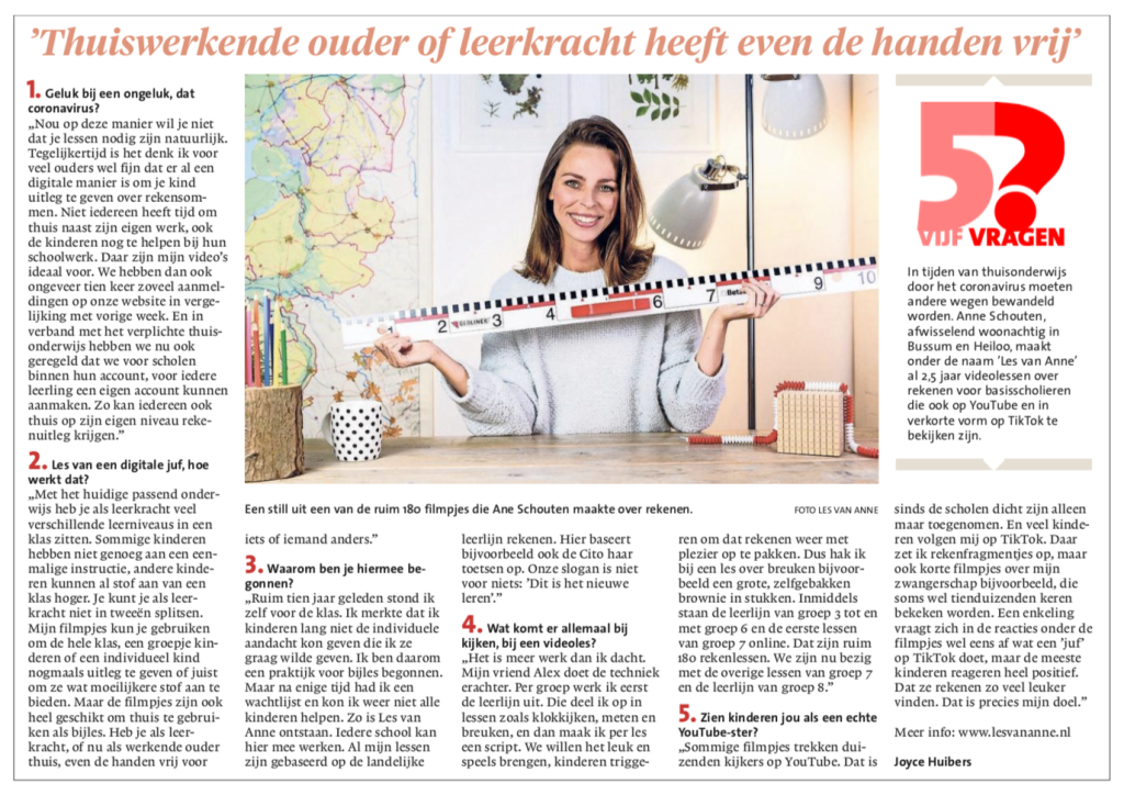 Joyce Huibers van de Gooi- en Eemlander interviewde me over thuisonderwijs. Ze stelde me vijf vragen, die ik in dit krantenartikel beantwoord. Ik vertelde haar, waarom ik aan Les van Anne ben begonnen en hoe de rekenlessen kinderen en ouders kunnen helpen, ook tijdens deze ’thuis-blijf-periode’. Benieuwd naar wat ik haar precies vertelde? Je leest het hier!