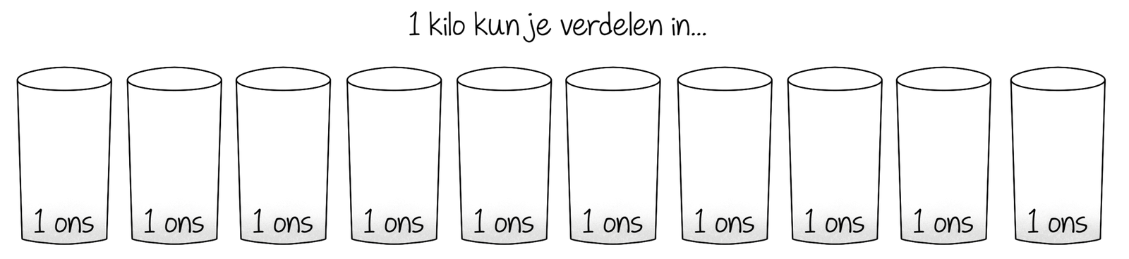 Dan ga ik het nu nog hebben over het ons. Je kunt een kilo suiker ook in onsjes verdelen. Je hebt dan 10 glazen nodig. Met 10 ons maak je namelijk weer een kilo.