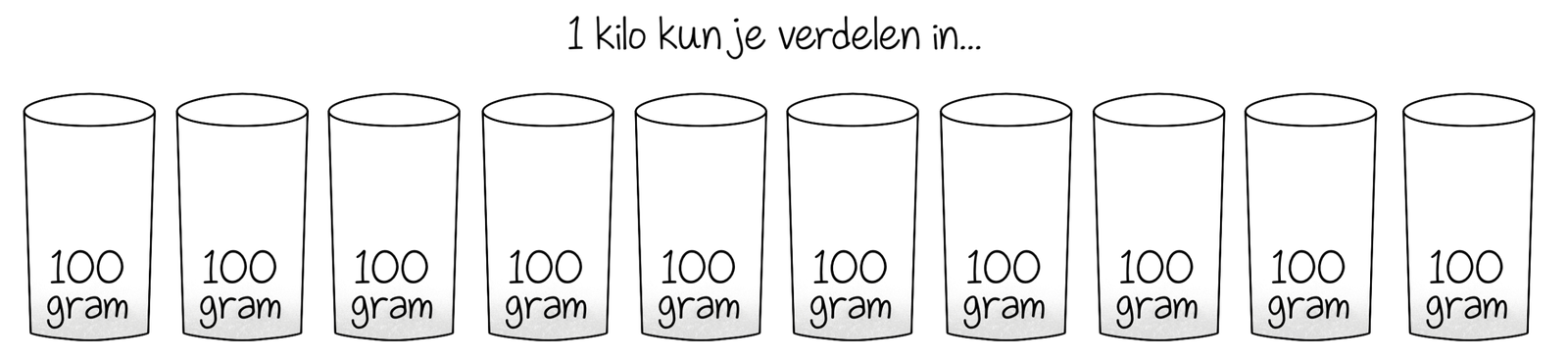 Er passen 1000 grammen in een kilo. Die kilo (oftewel, die 1000 gram) is nu verdeeld over 10 glazen. 1000 gram gedeeld door 10 = ..?