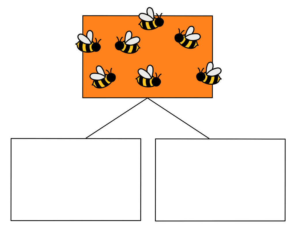 Hij mag zelf weten hoe hij de bijen splitst. Als hij kiest om 3 bijen in het eerste vakje aan de onderkant van het schema te tekenen, mag hij daarna bedenken hoeveel bijen er in het tweede vakje komen. Vervolgens mag hij de bijen in dat vakje tekenen.