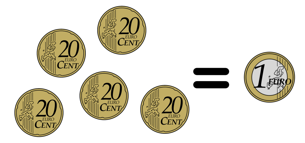 Bespreek nadat de munten zijn neergelegd, hoeveel munten van dezelfde waarde 1 euro maken. Legt je kind 5 munten van 20 cent neer, dan kun je zeggen: “Kijk, 5 munten van 20 cent maken samen 1 euro!”