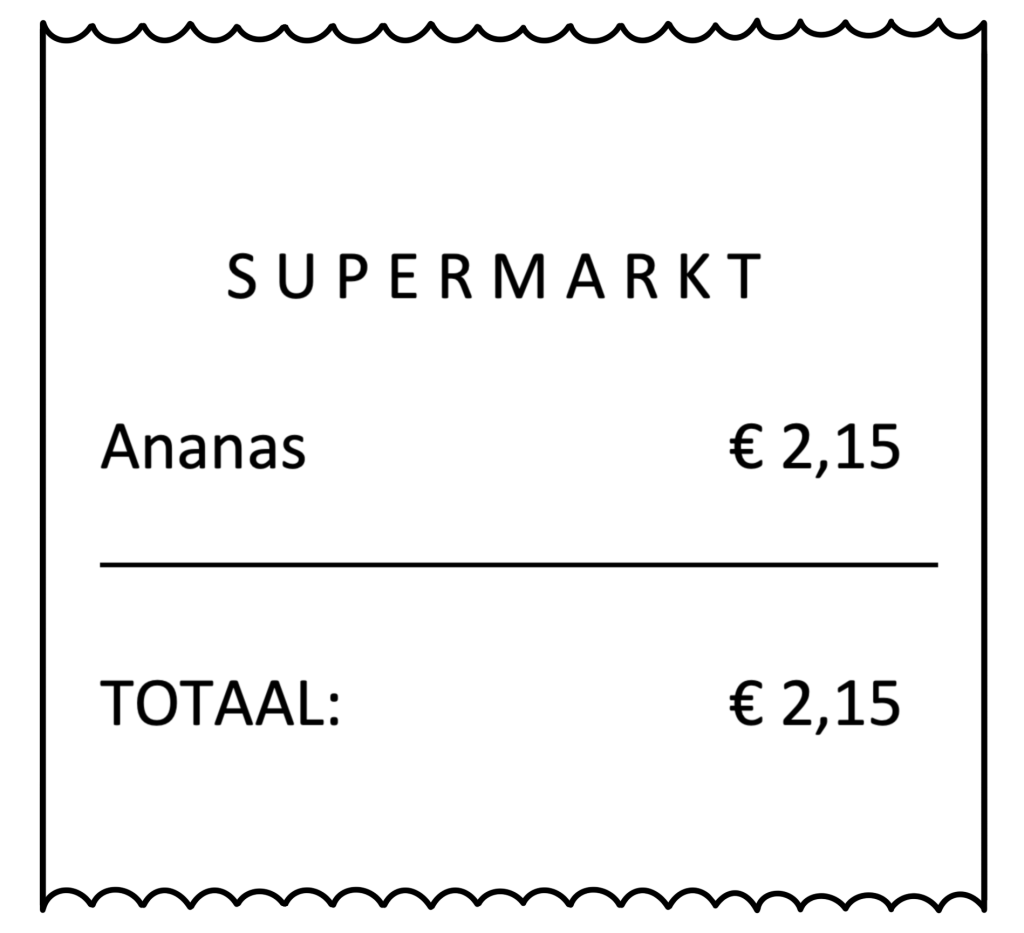 • Een aantal kassabonnen met bedragen onder de 50 euro (eindigend op 5 of 10 cent)