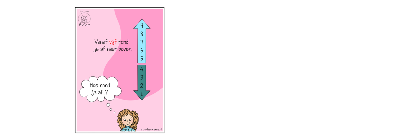 En dan de zesde, digitale rekenposter die ik heb ontworpen. Op deze poster is inzichtelijk gemaakt hoe je moet afronden. De poster helpt bij het aanleren van de volgende leerdoelen: