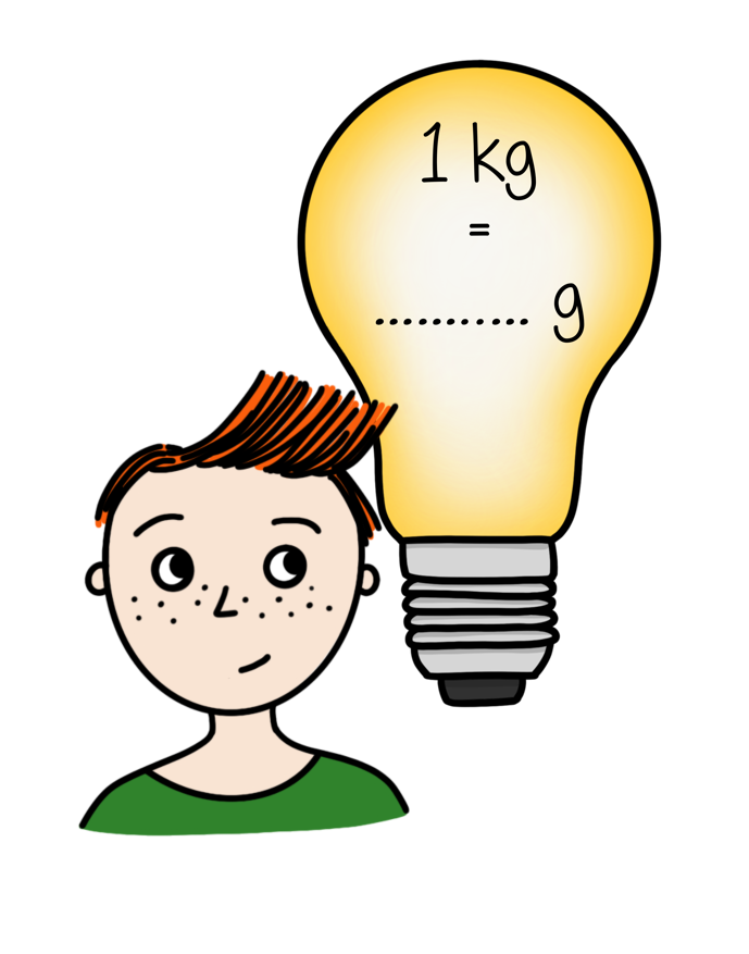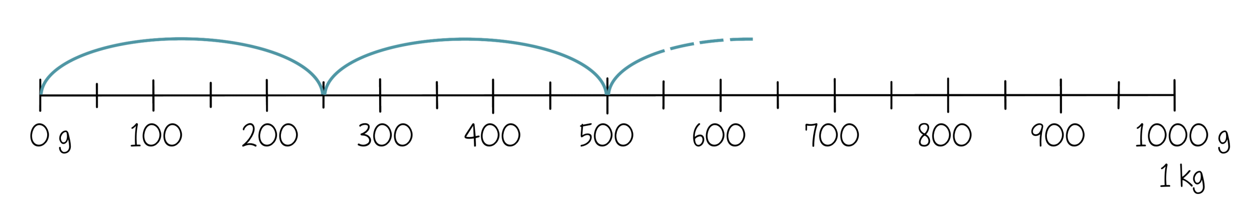 Misschien ziet je kind zelf al, als hij op de helft is, dat het 4 pakken moeten zijn. Zo niet, dan kan hij doorrekenen naar 750 en vervolgens naar 1000. Daarna kun je hem erop wijzen, dat 500 de helft is van 1000. Je laat je kind zien dat 500 gram (2 pakken) + een sprong van nog eens 500 gram (2 pakken) samen 4 pakken zijn. En dat gelijk aan 1000 gram!