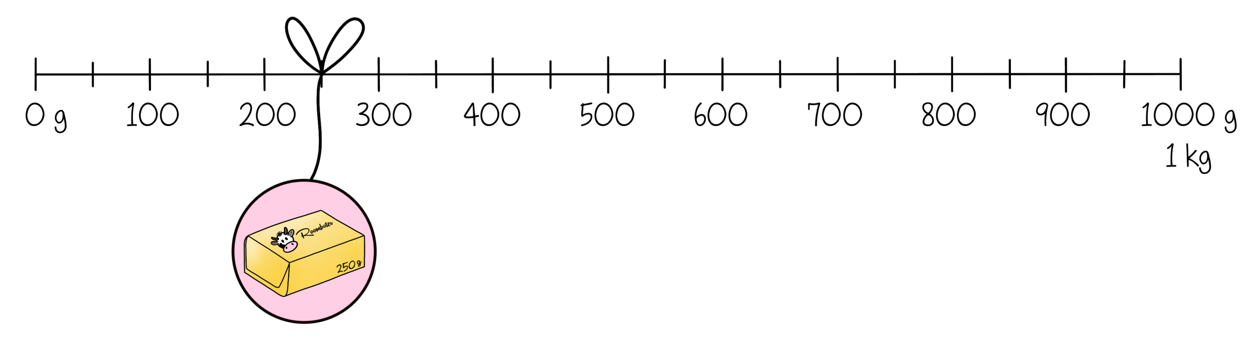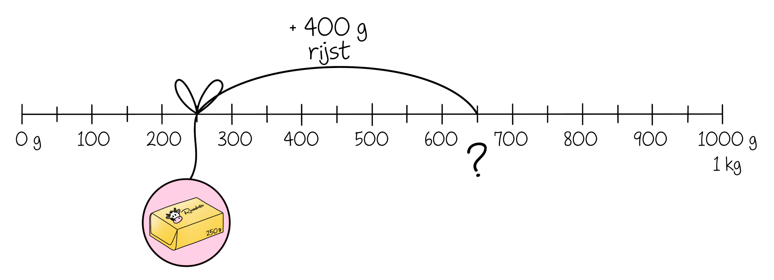 Als je kind een goed inzicht heeft gekregen in het gewicht van producten in grammen, is het tijd om te gaan rekenen! Maak sommen met de producten op de getallenlijn. Laat je kind van tevoren schatten, of het antwoord lichter dan, zwaarder dan of evenveel als 1 kilogram/1000 gram.